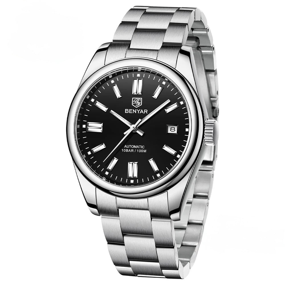 La BENYAR est une montre pour homme au design élégant, fabriquée en acier inoxydable avec mouvement mécanique automatique. Son cadran lumineux avec calendrier complet, protégé par un verre Hardlex résistant aux rayures, allie style et robustesse. Étanche jusqu’à 100M (10 bars) et disponible en plusieurs coloris (bleu, noir, vert, rouge, jaune), elle s’impose comme une montre de luxe abordable, parfaite pour un usage quotidien comme pour les occasions spéciales.